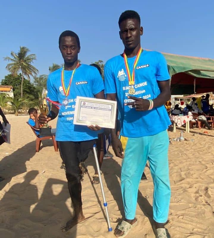 Babacar Diop, apprenti de Paul Dione à l’atelier orthopédique de l’hôpital, est amputé d’une jambe et vient de remporter, pour St-Louis Handicap, la médaille d’or lors d’une compétition de ”paracanoë” à M’Bour, sud Sénégal. Bravo Babacar, sincères félicitations de la part de l’association ”En Avant Roule ”.