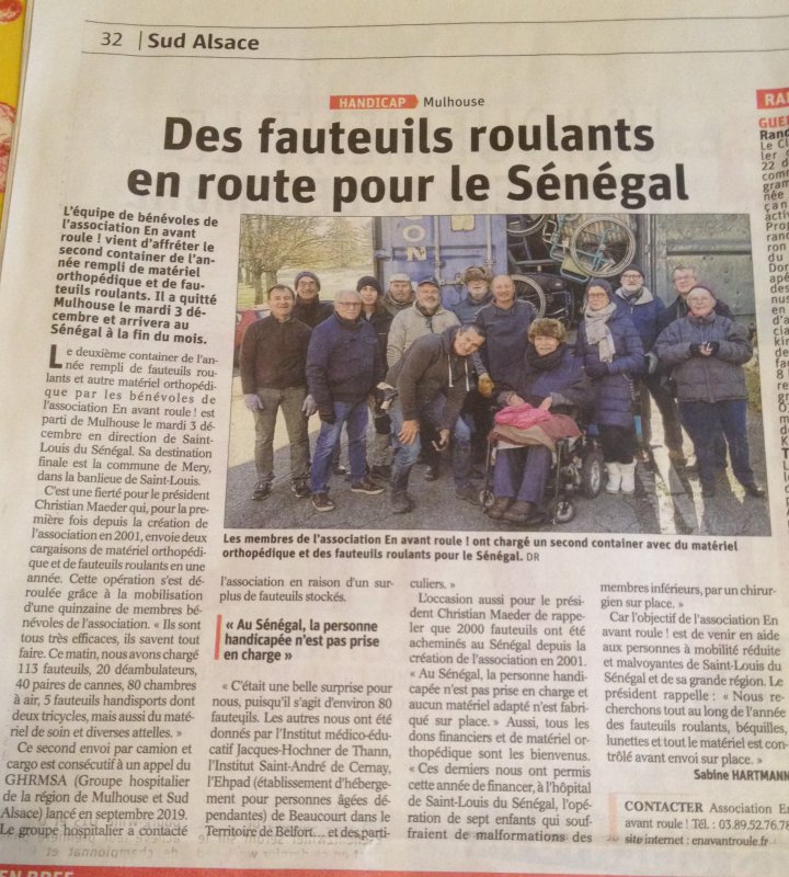 Ainsi, la précieuse cargaison d'environ 113 fauteuils, cannes, béquilles a été chargée dans cette chaleureuse, amicale, fraternelle ambiance. L'encombrant colis de noël mais non moins attendu,rêvé arrivera à destination à Dakar mi décembre. Il sera acheminé dans la région de Saint Louis à MERY, commune non loin de PODOR. Cette nouvelle destination sera avantageuse pour les personnes éloignées de la grande ville qu'est Saint Louis.